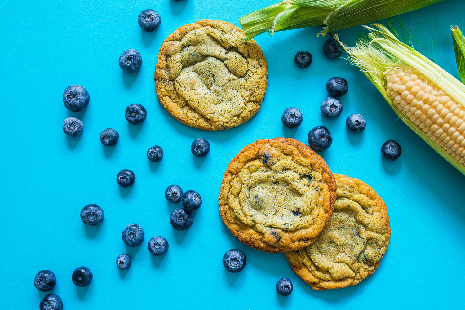 Buttery, yellow corn-flavored cookies mixed with blueberries. When you work for famous chefs like Gordon Ramsay, Wolfgang Puck, and Jean-Georges, you know the flavor combinations will be classic yet unique. However, instead of relying on a recipe in my repertoire, this was the evolution of attempting to make a blue corn cookie for my friend Clover, which took an unexpected turn when another set of friends made the recipe and added frozen blueberries (too wet!). It was an easy fix with freeze-dried blueberries and an end product filled with sumptuous textures and fun flavors.